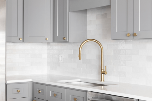 Accents are a fun way to spice up the kitchen and bring attention to detail. When pairing with light grey kitchen cabinets, we suggest going with metals to compliment the grey tones. Silver, black or gold features make great accents for the kitchen scenery.
